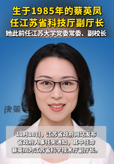 近日,江苏省人民政府发布人事任免通知,其中,任命蔡英凤为江苏省科学技术厅副厅长。