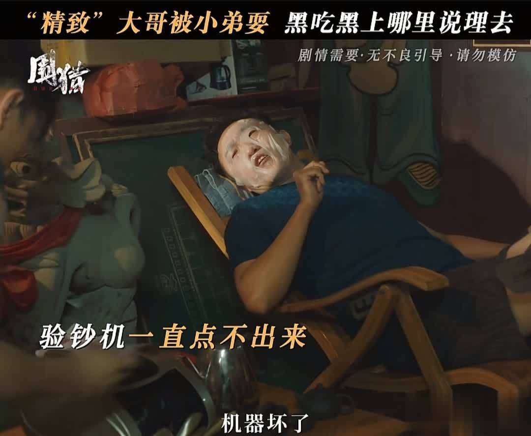 田昊塑造的万金牙,光听名字就带着一股狠戾之气。那一口标志性的金牙,配上贪婪凶狠的眼神和草莽做派,活脱脱一个盘踞一方的地头蛇形象。这个角色欲望膨胀、手段毒辣。开头假意与马仔叔合作,转眼就盘算着如何“黑吃黑”,甚至动了杀心。